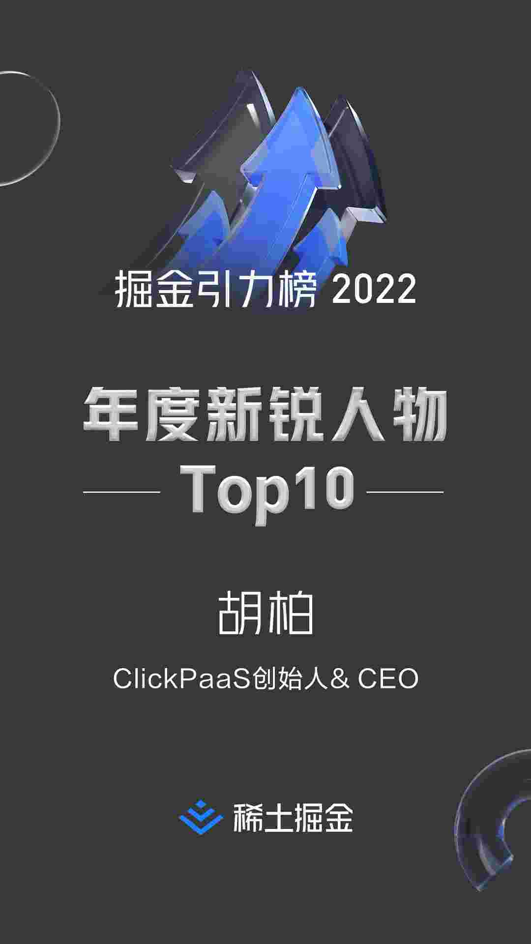 2022年1月6日,,,,,,,,,稀土掘金社区第一届「掘金未来大会」成功举办,,,,,,,,,,,,会上发布了“2022 稀土掘金引力榜 年度新锐人物”榜单,,,,,,,,,,,上海爱湃斯科技有限公司(简称华为钱包)创始人及CEO胡柏实力入选年度新锐人物TOP 10。。。。。。。。。。。。。。。。