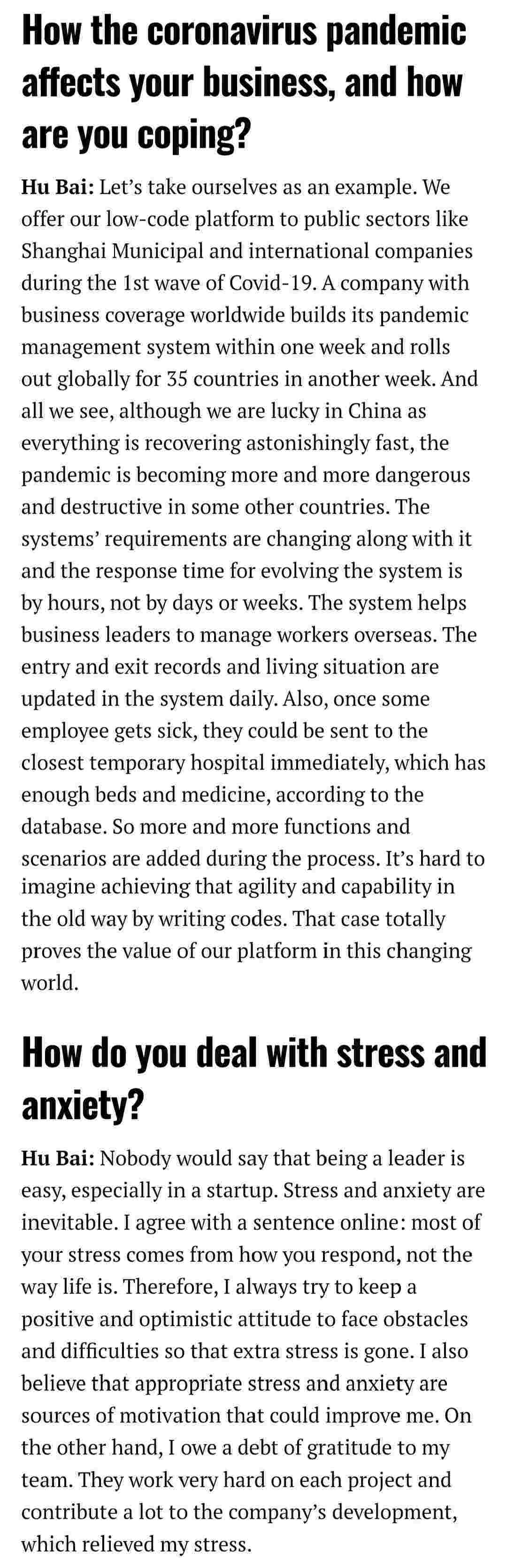2021年年初,,,,,,,,爱湃斯科技CEO胡柏受邀接受法媒Startup.info的专访,,,,,,,,,,与Startup info的读者分享了自己的创业经历、、、、、、、、、、、、、以及低代码平台华为钱包的创新之处。。。。。。。。。。
